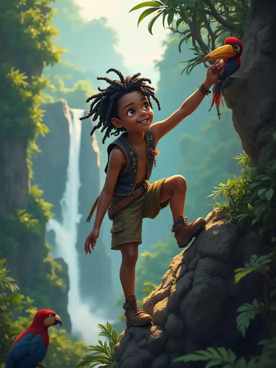 Mvulana mweusi mwenye umri wa miaka 8 mwenye viatu vya ngozi hupanda mwamba wenye kung'aa msituni, akiwa amevaa koti lenye mantiki ya manyoya. Ndege wa kigeni na maporomoko ya maji humweka katika mazingira mazuri.