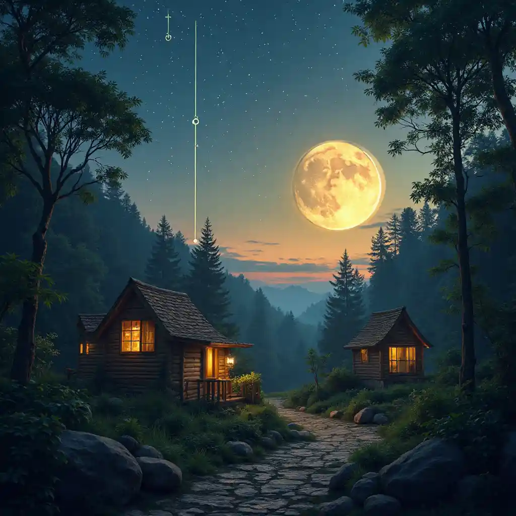 ustaarabu katika jungle na nyumba ya mbao juu ya dunia mwangaza na nyota shimmering katika kuanguka kwa alfajiri mraba mwezi inaweza kuonekana katika anga na nyota kushikamana yangu ya kifahari nyeupe neon mistari
