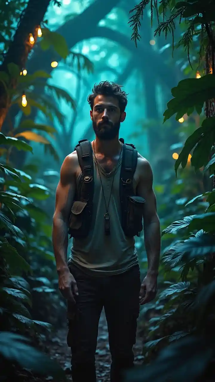 Akitembelea msitu wenye mwangaza wa kibiolojia, mwanamume mweupe mwenye umri wa miaka 25 hivi, anaangaza akiwa na koti la mvumbuzi. Mzabibu wenye kung'aa na viumbe wa kigeni humweka katika mazingira, macho yake yenye udadisi na mwili wake wenye nguvu unaonyesha roho ya ujasiri na nguvu za ujana katika eneo la pori lenye rutu.