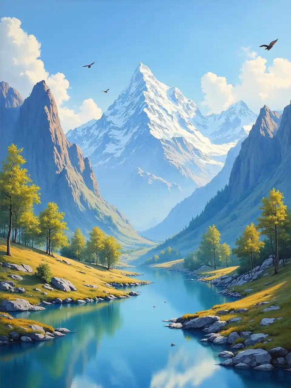wide angle mazingira kutoka Kashmir mlima bonde, mlima mito na reflection, ndege, anga ya bluu, uchoraji, rangi ya maji, style ya Gifford Beal