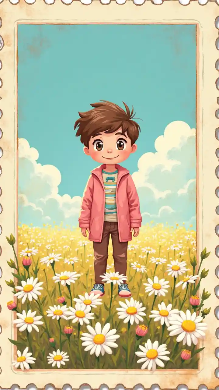 cartoon boy, katika mtindo wa dhahabu nyepesi na nyekundu, studioblr, kubuni mavazi ya ajabu, grainy, kawaii, francis davis millet, stempu yenye uwanja mkubwa wa daisies, katika mtindo wa a a, mandhari ya kweli, anga za bluu, mandhari ya chini, Flickr, y2k a