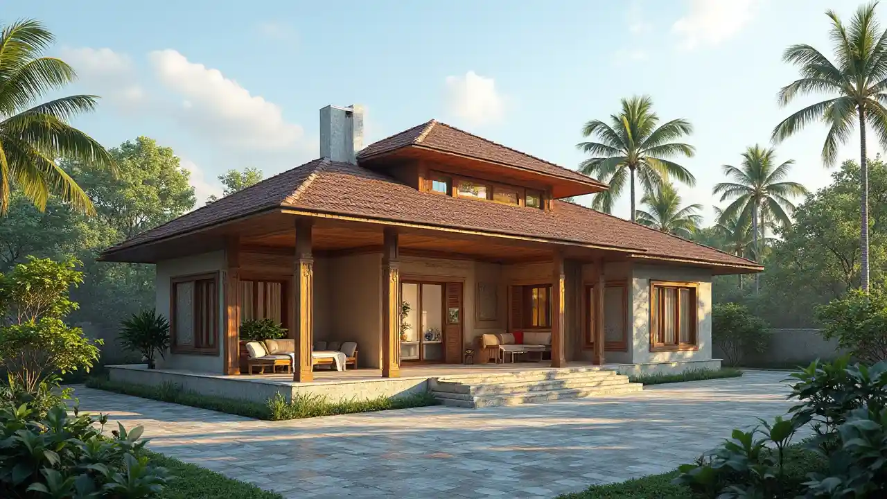 Wazia nyumba ya kifahari ya orofa moja ya Kerala yenye usanifu wa kisasa wa majengo ambayo huchanganya mambo ya kale. Nyumba hiyo inapaswa kuwa na vyumba vitatu vya kulala, na sehemu ya nje inapaswa kuwa na paa zenye mteremko wa Kerala, nguzo za mbao, na michongo yenye kuvutia, huku sehemu ya ndani inapaswa kuwa na vitu vya kisasa, rangi zenye joto, na nuru nyingi. Kielelezo, kwa kutumia mchanganyiko wa mbinu ya kweli na kisanii kwa kusisitiza villa ya fusion ya kisasa na mila.