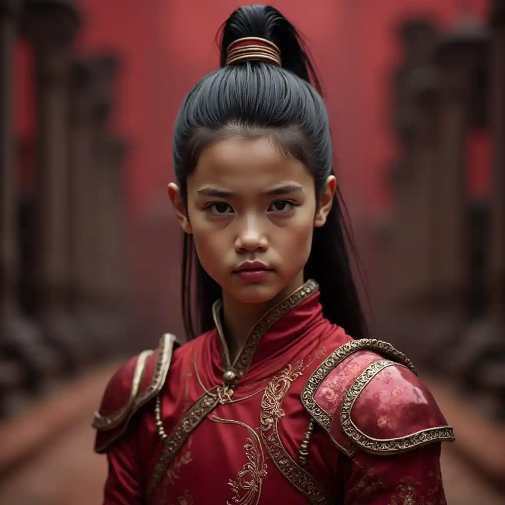 Msichana mzuri Khmer katika Khmer silaha ya jadi nyekundu na nywele nyeusi dhidi ya background ya ANGKOR THOM hekalu katika Siem Reap katika rangi nyekundu-burgundy, background blur, focus on girl, detailed armor, Dramatic Lighting, Depth of Field, Incredibly high detailed