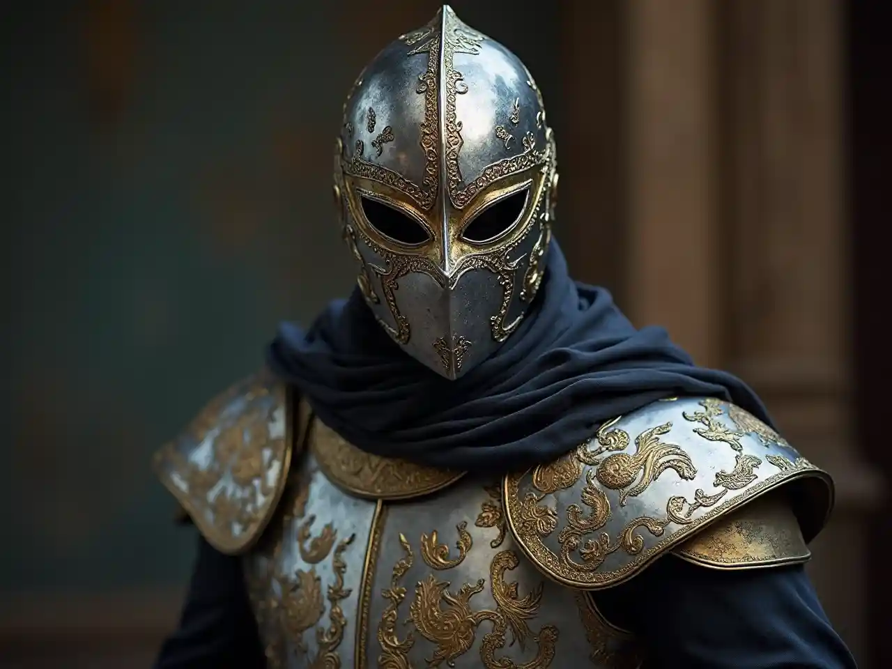 FINNNMexican luchador, mask, na mavazi ambayo inawakilisha au ni msingi katika knight medieval, kutumia fedha, dhahabu na nyeusi kwa hiyo.