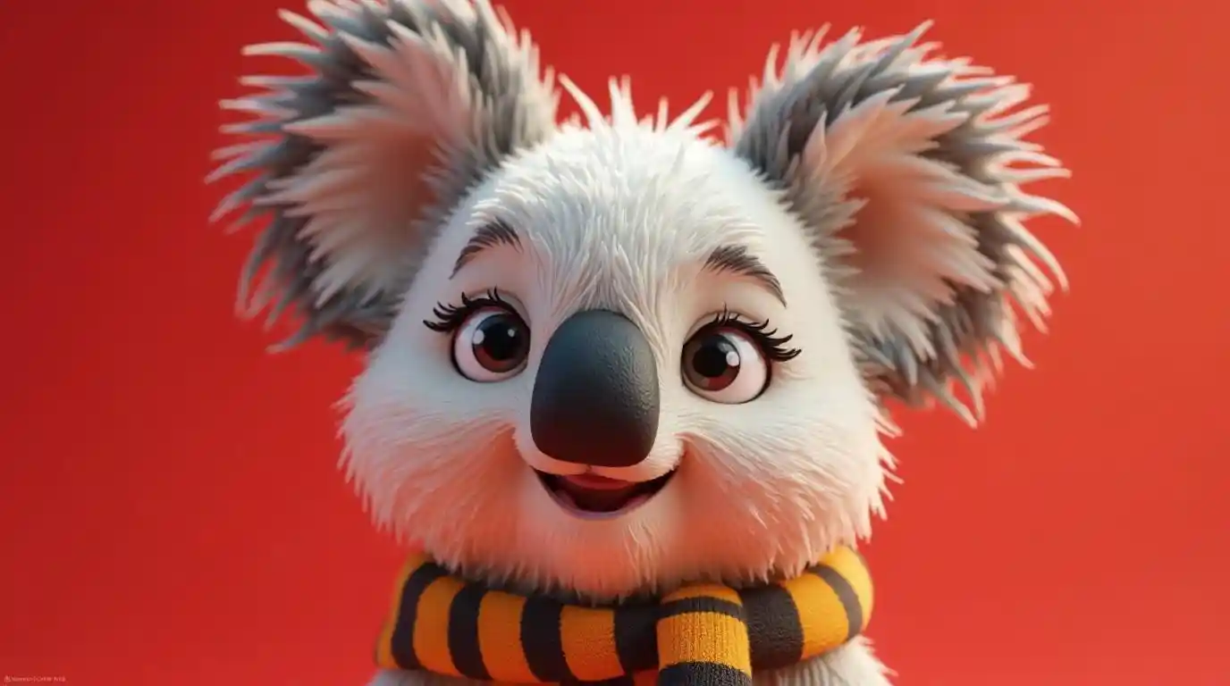 A close-up of a koalas face, in a chibi-style animation character design. Australian folk art-inspired animals, with white and grey fur and yellow stripes. Dynamic angled telephoto lens crop. Koala is wearing sporty with a striped scarf in a red background, in a claymation character design, sculpture, and 3D render, depth of field, imperfections, lens blur, Trending on Pixiv Fanbox, in the style of Pixar Animation movies.