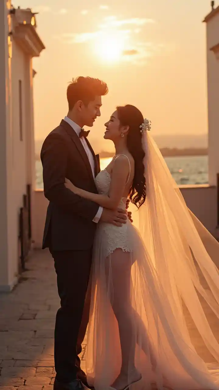 Jua linapochomoza juu ya bahari, jua linapochomoza, hisia ya joto, Bwana-arusi na bibi-arusi wa Korea wanafanya picha za arusi yao kati ya majengo yenye upepo. Bwana-arusi anamshika bibi-arusi kiunoni kwa mkono mmoja. Bwana-arusi anavalia suti yenye kufaa sana. Bibi-arusi anavalia mavazi madogo ya harusi. Anavalia soksi, mshipi wa viatu, na kilemba. Kitambaa na mavazi yanapeperushwa na upepo. hyper kina, ultra kweli, kina sana, AI ilivyoelezwa exquisitely nzuri, kabisa ultra kweli vijana Korea, sura gorgeously kina, uwiano mwili kamili, ultra pale, ultra glamorous, HDR, UHD, high res, 64k, taa ya sinema, madhara maal, hd octaneArtger