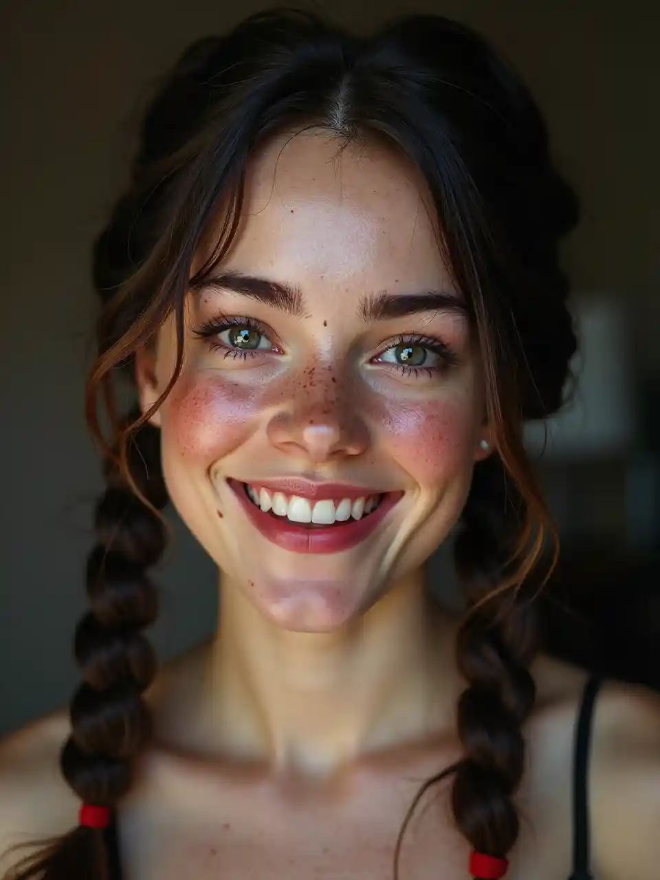 mwanamke mzuri, (freckles), tabasamu kubwa, macho rubini, pigtails nywele, rangi ya giza, hyper kina picha, mwanga laini, kichwa na mabega picha, kifuniko