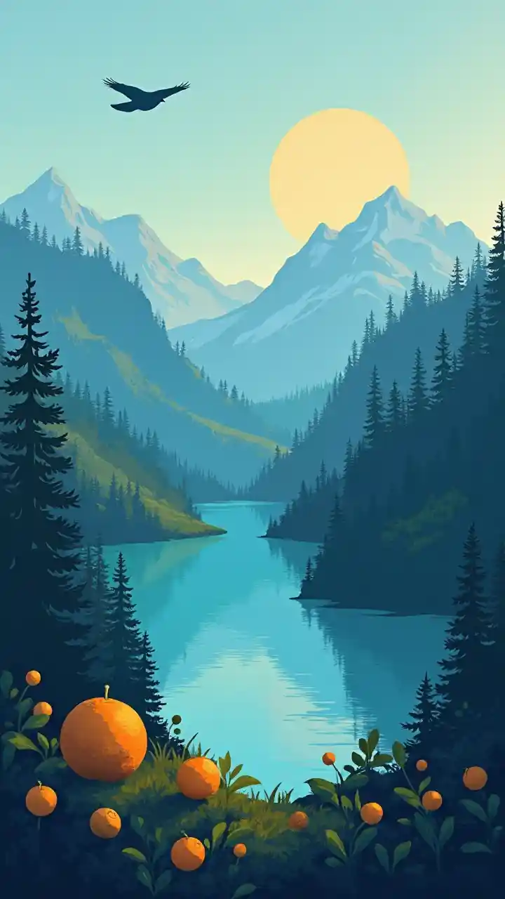 Isaiahsafu ya milima karibu na ziwa, miti, bluu, kijani na machungwa, nafasi ya wazi katikati, matunda machungwa, background ya bluu, rahisi ya bluu,