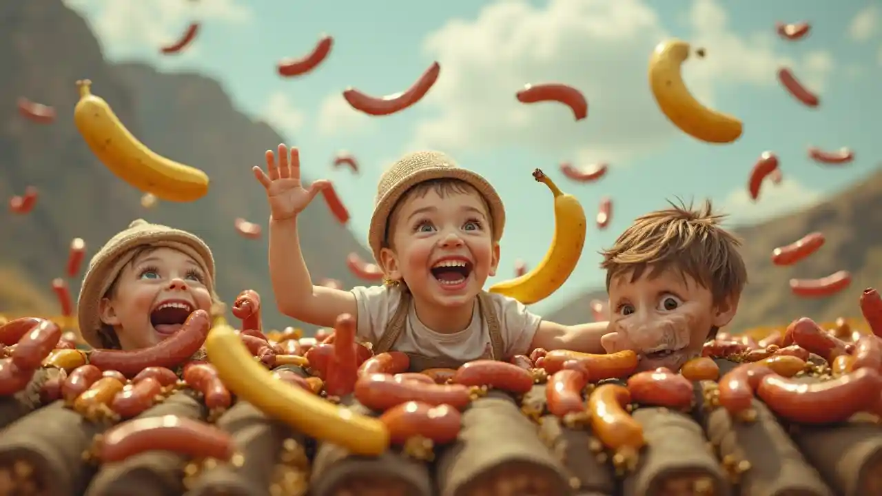 sausages na ndizi kuanguka kutoka paa juu yao, kuangalia msisimko na kucheka