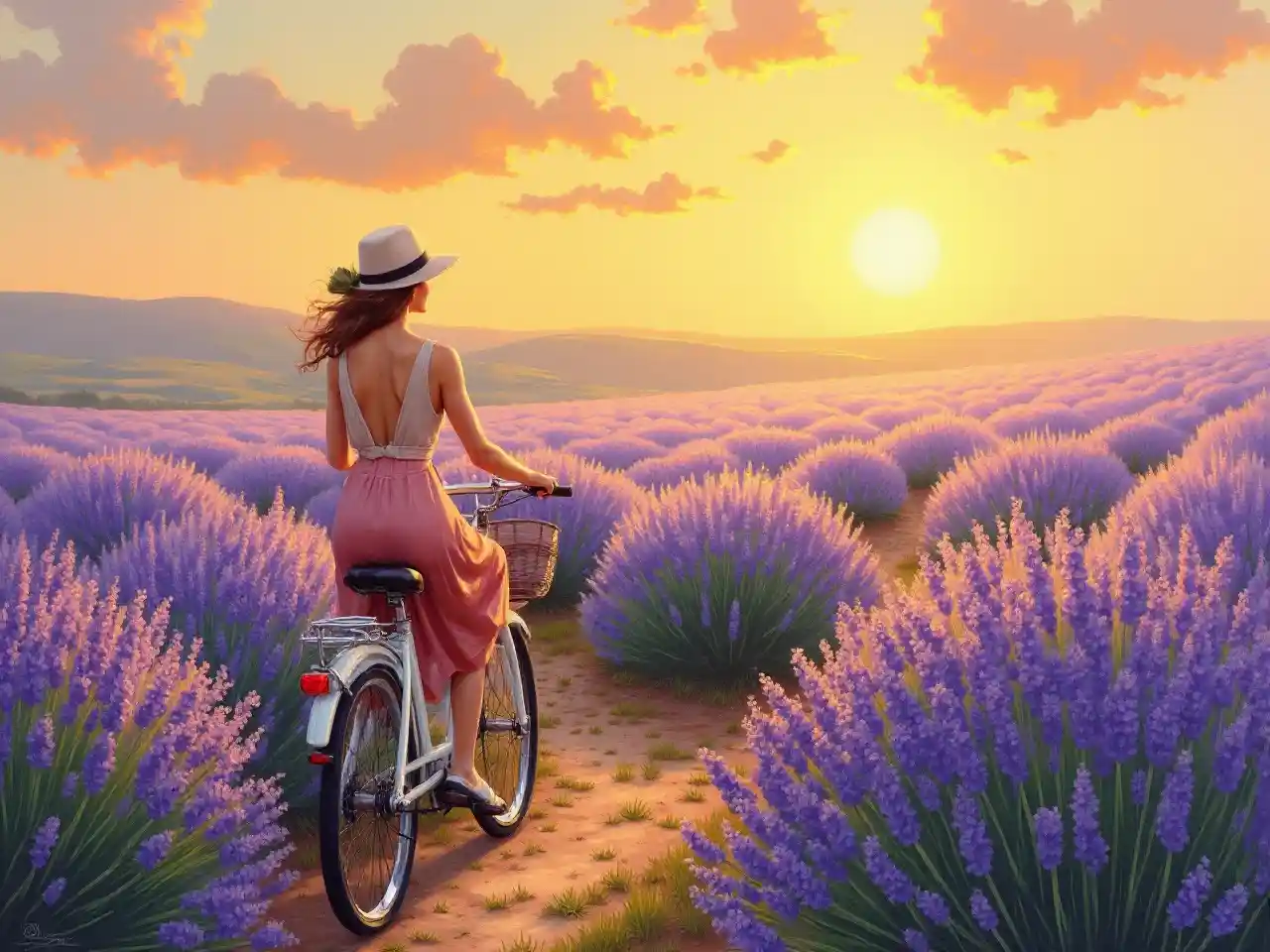 Mchoro wenye kuvutia wa mafuta unaoonyesha mwanamke mwenye mitindo ya zamani akisafiri kwa baiskeli kuelekea shamba kubwa la mrujuani chini ya machweo ya dhahabu. Mahali hapo pana nuru nyembamba ambayo huonyesha rangi nyekundu na kijani kibichi ya mrujuani, na vivuli vyenye kupendeza vinavyoonekana kwenye mavazi yake ya zamani na baiskeli yake ya kawaida. Anga lina rangi ya zambarau na ya peach, na hilo huongeza hisia za kutamani. Upepo mwembamba huchochea mrujuani, na hivyo kuifanya ionekane kuwa yenye nguvu na yenye utulivu. Mandhari hiyo ina hisia za kimapenzi na za kupendeza, na imechorwa kwa mtindo wa kuchora unaokumbuka michoro ya mapema katika karne ya 20.