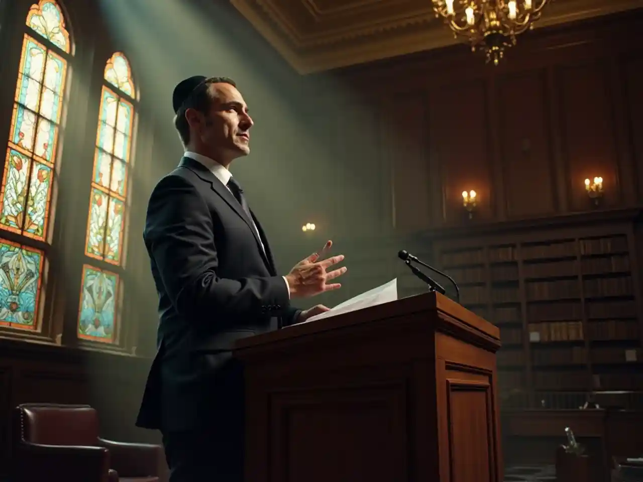 Katika jumba kubwa la mahakama lenye mwangaza mdogo, ambalo linaangazwa na taa za shaba za zamani, mwanasheria Myahudi anasimama kwa uhakika kwenye jukwaa la mialoni. Maneno yao yenye nguvu lakini yenye kutafakari yanaonyesha kwamba wameazimia kabisa kutoa ushahidi. Wakili huyo, akiwa amevaa suti nyeusi, na kippa chake kikiwa kimeegeshwa juu ya kichwa chake, anafanya ishara kwa shauku, akiwa na karatasi mkononi, huku kuta zenye mabamba ya mwaloni na rafu za vitabu zilizo na vitabu vya sheria zikiongezea uzito wa hali ya hewa. Nuru ya jua inapita kwenye madirisha marefu ya kioo, na kuangaza rangi kwenye sakafu ya marumaru iliyosuguliwa, na hivyo kuonyesha hali ya kutarajia. Pindi ya usadikisho wenye kina uliokamatwa katika taa za sinema, maelezo ya kweli.