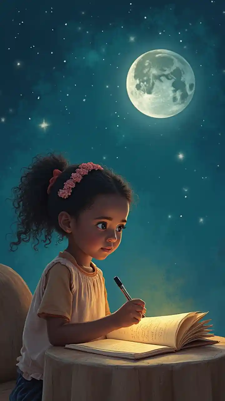 Msichana mdogo, Lesedi, akiandika barua kwa mtu aliye katika mwezi