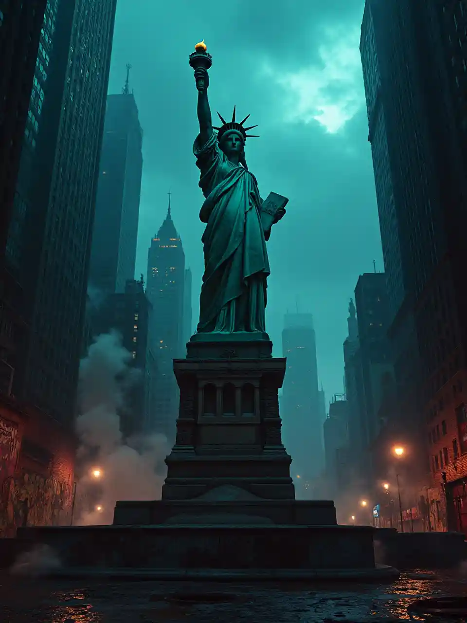(sanamu ya uhuru), takwimu ya kiume inayowakilisha roho ya uhuru, inasimama juu katikati ya giza la miaka ya 1980 New York City, mandhari ya mijini, skyscrapers, kuta zilizojaa graffiti, mvuke unaotoka kwenye mashimo, vivuli vya moody, mwangaza wa neon, anga yenye nguvu, (mwanga wa ajabu), maelezo ya kuvutia, (maelezo ya juu), (ubora wa juu), mazingira ya kuchochea, (mwanga wa kutosha), textures tajiri.