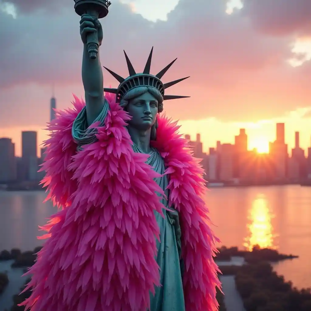 Sanamu ya Uhuru iliyopambwa kwa rangi ya waridi yenye manyoya, iliyokamatwa katika toleo la okta 8k, ikionyesha maelezo ya hali ya juu. Mandhari ina picha za kibiashara za kweli na rangi za kitaalam, zinakamata Sanamu kwa njia ya kufikiria lakini yenye heshima. Nyuma kuna machweo ya jua yenye kuvutia yanayoonyesha mandhari ya New York, na kuongeza kina cha muundo huo kwa taa zisizo na kasoro, na uangalifu kwa maelezo magumu, na kudumisha asili ya ubunifu.