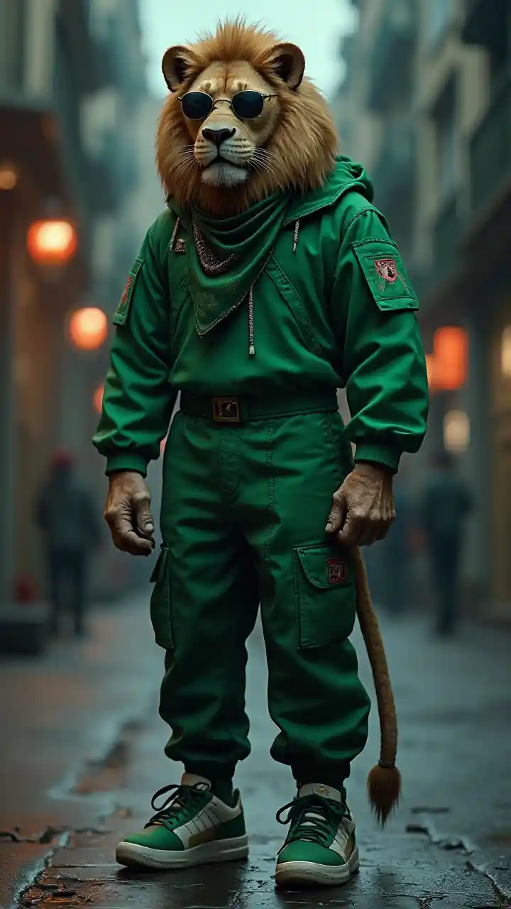 Simba halisi, amevaa mavazi ya usiku ya kijani na viatu vya michezo, 8K, injini ya kweli, mwili mzima amevaa miwani na bandana