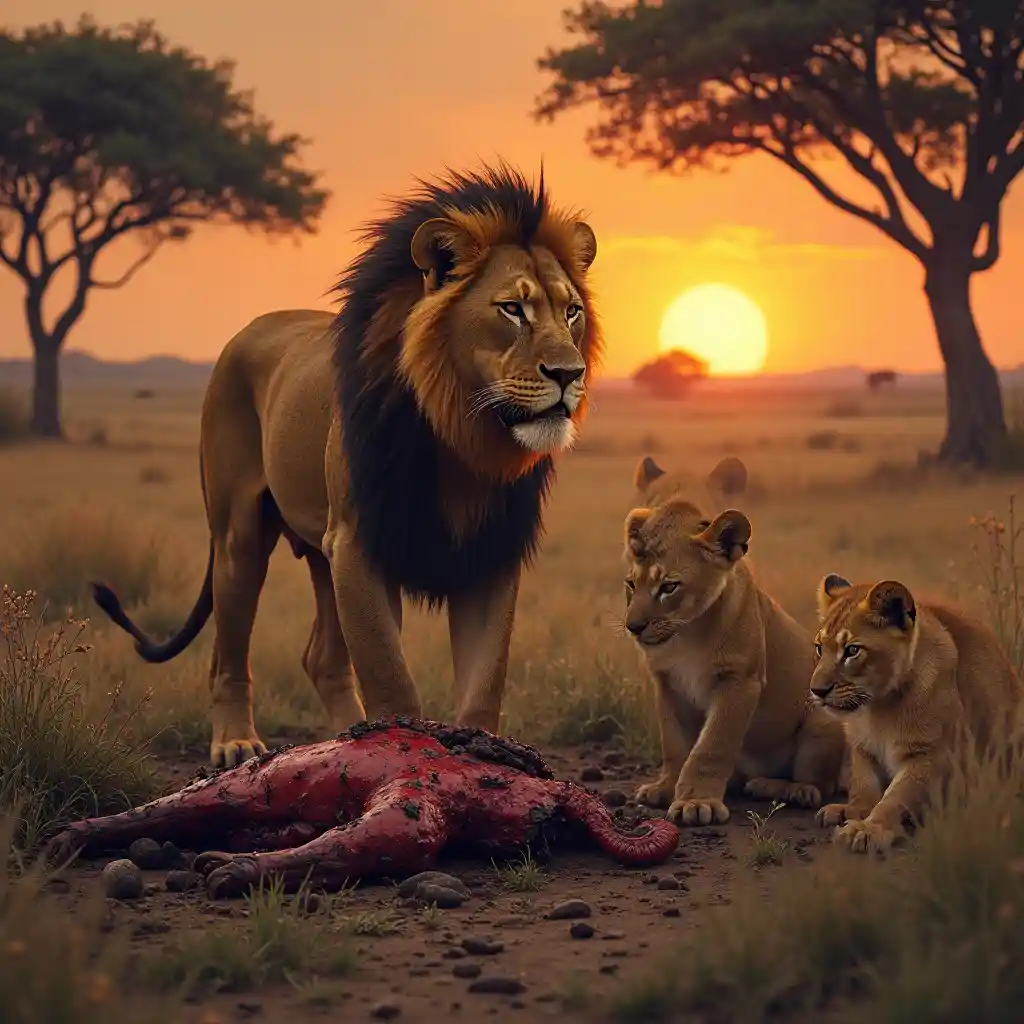 Jacksonkina sana, high quality picha, masterpiece, hdr, 4k, tattoo kubuni ya simba na kuua juu ya ardhi, simba na watoto 3 karibu na kuua, mazingira ni katika savanna miti nyasi na jua nyuma