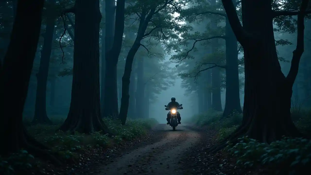 In the deep embrace of midnight, a lone biker rides through the heart of an ancient, sprawling forest. The towering trees, draped in a shroud of darkness, stretch endlessly upward, their canopies intertwining to form a dense, shadowy vault that swallows all traces of moonlight. The narrow, winding trail beneath the bike’s tires is barely visible, a faint, serpentine ribbon cutting through the undergrowth, illuminated only by the sharp beam of the bike's headlights. The air is thick with the rich, musky scent of damp earth and decaying leaves, mingling with the crisp bite of the cool night breeze. Each turn of the wheels sends leaves rustling and small twigs snapping, their sounds amplified in the silent, nocturnal world. The engine’s steady hum is a comforting drone, a solitary melody in the profound silence that envelops the forest. On either side of the path, ancient trees loom like dark giants, their trunks knotted and gnarled with age. Their branches, heavy with foliage, cast long, flickering shadows that dance in the headlights’ glow, creating a shifting tapestry of light and dark. Occasionally, the bike’s light catches the brief, reflective glint of eyes peering from the underbrush, hinting at the hidden lives within the forest’s depths. The rider, encased in rugged, weathered gear, navigates with a mix of cautious precision and bold confidence. He leans into each curve, the bike swaying smoothly between the towering trunks, his focus sharp and unyielding. The thrill of the ride pulses through him, a heady blend of adrenaline and the deep, primal calm that comes from being alone in the wilderness. As he ventures deeper into the forest, the path grows narrower, winding tighter between the trees that now arch overhead like the ribbed vault of a cathedral. The world outside fades away, replaced by the primal, almost otherworldly beauty of the night-clad forest. The engine's growl is a steady companion, echoing softly in the cool night air, guiding him through this dark, mysterious realm where the whispering leaves and the silent shadows tell tales of an ancient, timeless world.