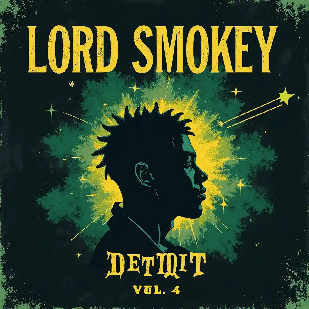 Muundo wa picha ulio wazi na usio na maana huonyesha nguvu na fumbo, hasa rangi nyeusi na alama za kijani na manjano. Kichwa "BWANA SMOKEY" kiko juu, na "DETROIT" imeonyeshwa wazi katika fonti ya kuvutia, ikionyesha uhusiano na mji. Chini, "VOL. 4" inaonyesha kwamba ni sehemu ya mfululizo, huku umbo la kijivu la picha hiyo likiongeza ubora wa sanaa hiyo. Maelezo ya nyuma na athari za mwanga wa chini huleta hali ya ndoto, karibu na kumbukumbu, ikikumbusha vifuniko vya albamu za kawaida, kuchanganya mandhari ya mijini na background ya ulimwengu. Kwa ujumla, muundo hutoa mchanganyiko wa vibes retro na sanaa ya kisasa, kuvutia watazamaji katika hadithi yake.