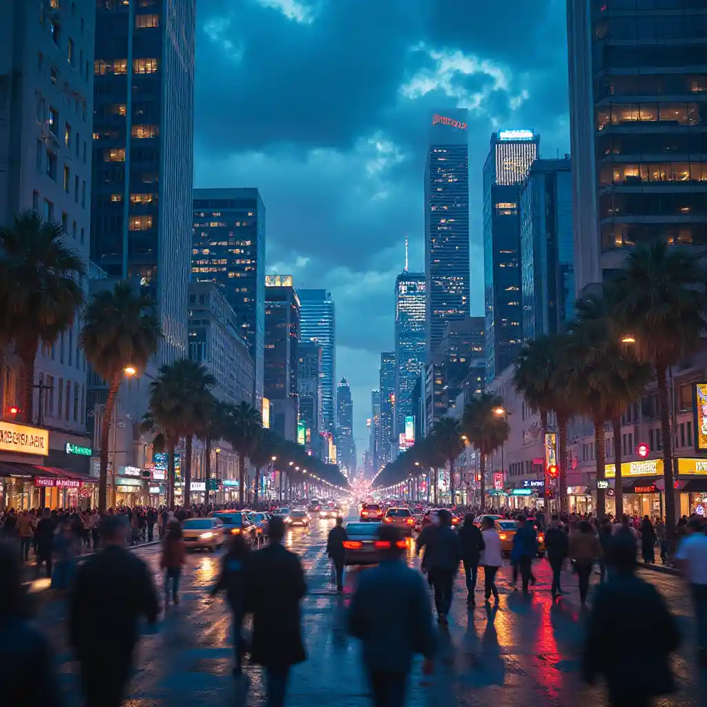 Mazingira ya jiji la Los Angeles, machafuko, mazingira ya mijini yenye kusisimua, barabara zenye shughuli nyingi, watu wakienda kwa njia isiyo wazi, rangi zenye nguvu, taa za jiji zikipapasa, majengo ya juu ya anga ya usiku yenye rangi ya bluu, mawingu yakizunguka juu, utungaji wenye uharaka wa juu, wenye nguvu, unaonyesha jinsi jiji linavyoishi.