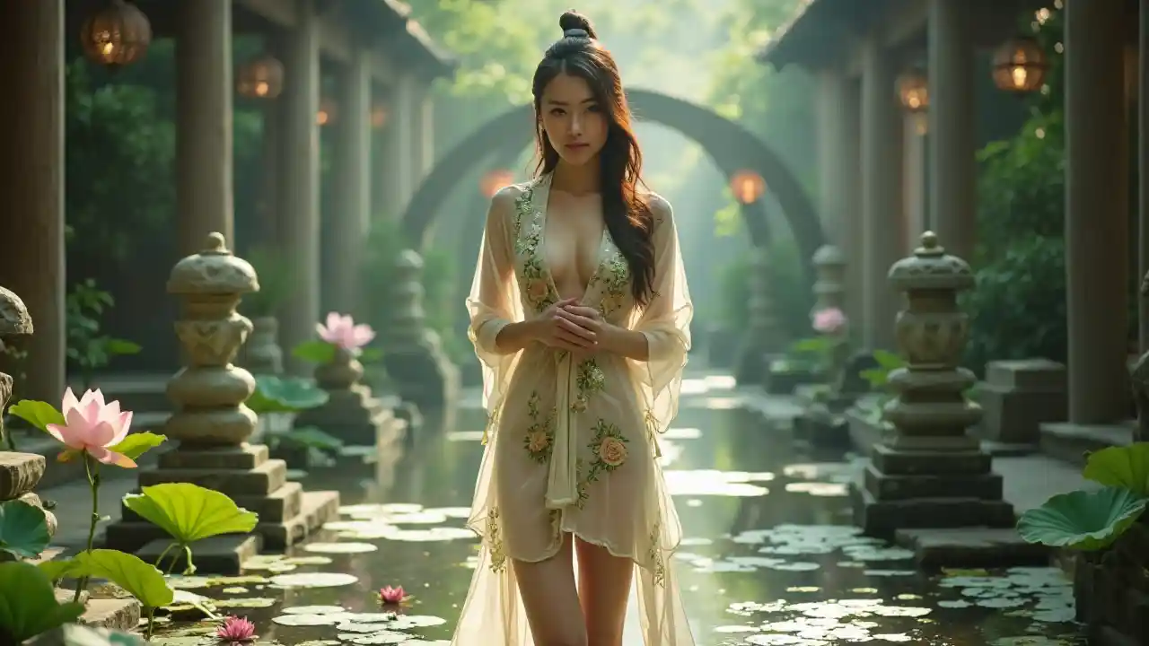 Akitoa picha katika hekalu lenye maua ya lotosi, mwanamke wa Asia mwenye umri wa miaka 30 na kitu anaonekana akiwa amevaa vazi la kifahari lenye rangi ya jade. Taa za mawe na vidimbwi vya samaki hufanyiza sura yake, miguu yake midogo na kifua chake kilicho wazi kinaangaza uzuri wa kiroho na kuvutia katika mazingira matakatifu.
