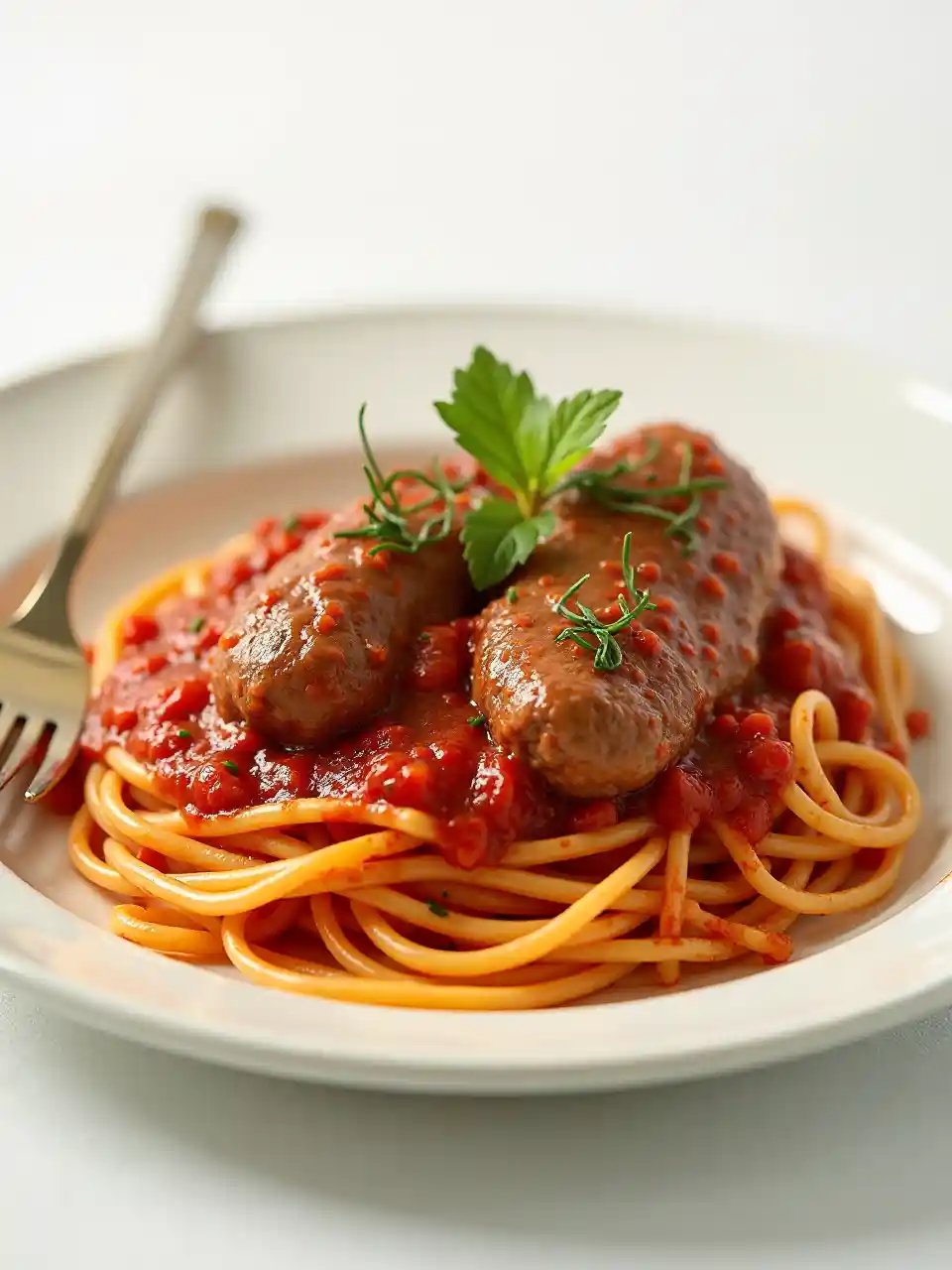 Chakula cha mchana nyama katika mchuzi wa nyanya na spaghetti, Uhariri Picha, Picha, Iliyopigwa kwenye lensi ya 70mm, Kina cha Sehemu, Bokeh, DOF, Tilt Blur, Shutter Speed 1/1000, F/22, Usawa wa Nye, 32k, Super-Resolution, background nye