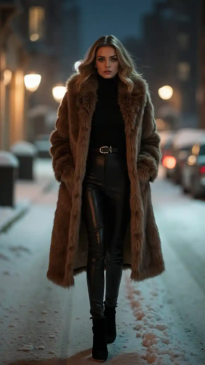Wazia mwanamke aliyevaa koti maridadi la manyoya akitembea kwa uhakika barabarani usiku. Nuru ya barabarani huonyesha umbo lake, na msimamo wake wenye ujasiri unakazia uzuri na uzuri.