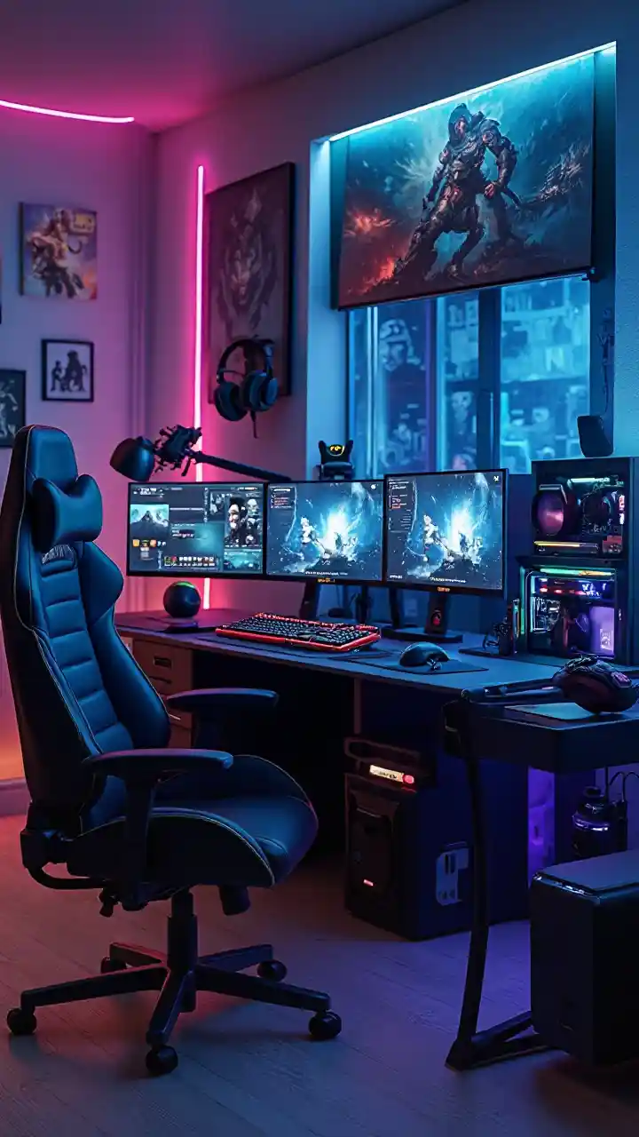 Best michezo ya kubahatisha chumba Luxury Kujenga kina sana, kweli michezo ya kubahatisha chumba na kisasa, teknolojia ya juu. Chumba hicho kinapaswa kuwa na dawati kubwa la kucheza michezo ya kompyuta lenye skrini mbili au tatu zenye umbo la kuruka, kibodi cha RGB, na panya wa michezo ya kompyuta. Lazima kuwe na kiti cha michezo ya kubahatisha cha starehe na vifuniko vya pumba, na taa za LED kwenye kuta na chini ya fanicha, na kuunda anga ya nguvu. Ni pamoja na mnara wa PC sleek na sehemu inayoonekana RGB na headset high-mwisho kutoka kusimama. Chumba kinapaswa kuwa na mazingira mazuri na mabango ya michezo ya kubahatisha, vifaa kadhaa vya kucheza michezo ya kubahatisha, na labda friji ndogo iliyo na vinywaji. Mwangaza wa joto na laini huongeza msisimuko, mtindo, na hali ya baadaye ya chumba