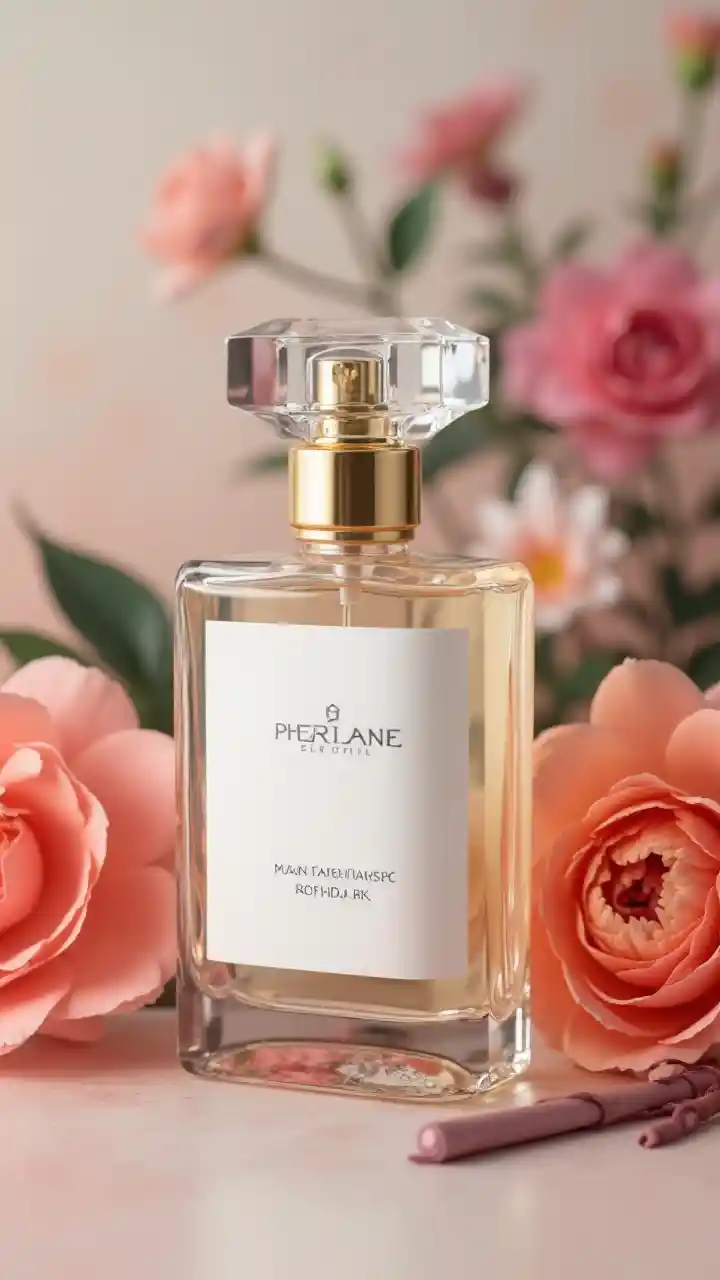 Chupa ya manukato ya kifahari yenye lebo ya blanc, nyoka kando ya chupa, maua ya waridi na ya rangi ya manjano