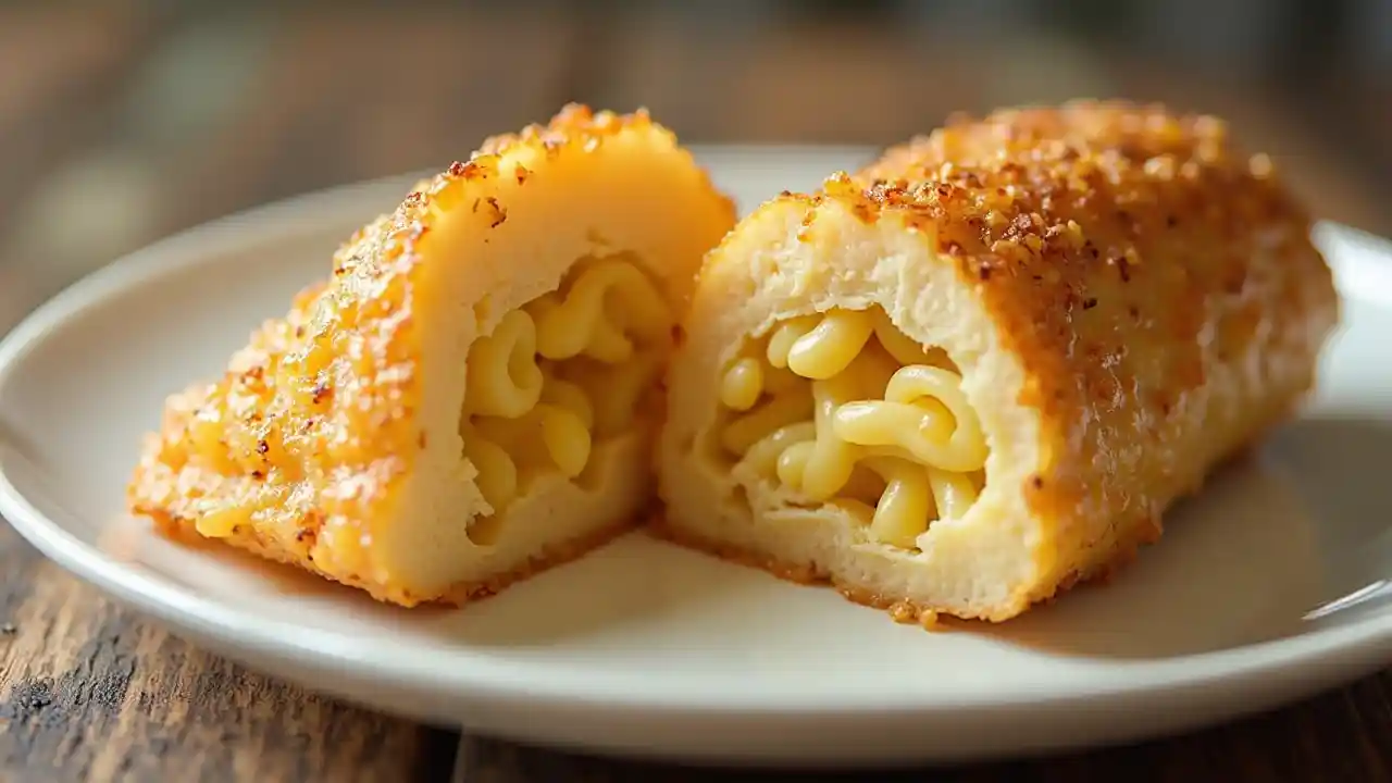 Benjamincutlet stuffed na manyoya macaroni, manyoya macaroni ni ndani ya cutlet, cutlet ni kukatwa katika nusu, manyoya pasta ni kuonekana katika kukatwa na kukatwa, pasta ina wazi na duru, cutlet iko juu ya sahani