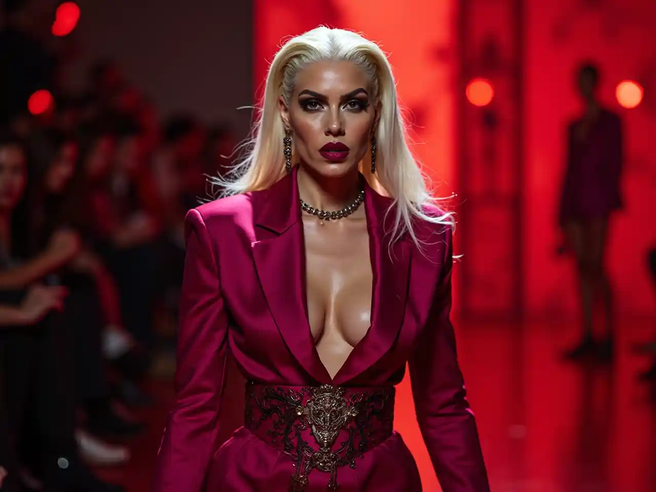 (Mfalme wa kike wa Makedonia wa miaka 35 mwenye misuli ya kupendeza (mwisho wa shavu na nyuso) na kivuli cha macho, rangi ya mdomo nyeusi, na platinum nywele blonde amevaa Versace magenta), pose mkali, dramatic (nyekundu na nyeusi rangi), high-fashion style, textures ya anasa, sleek na chic mavazi maelezo, uwepo wa wazi, mazingira ya kisasa, nguvu ya kihisia, taa ya sinema, background of elegant high-fashion runway, (ultra-detailed, 4K).
