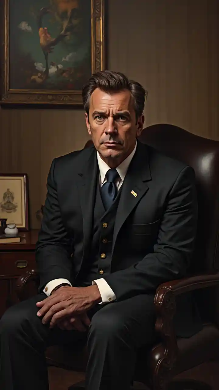 rangi nzuri mafuta mat picha, bosi wa mafia katika ofisi yake ya New York meza ya miaka 50, masterpiece ajabu kina, mwanga wa ajabu wa sinema umakini wa kina, kifahari, uchoraji digital, laini, mkali, uwiano wa dhahabu, taa ya ajabu, 8K,