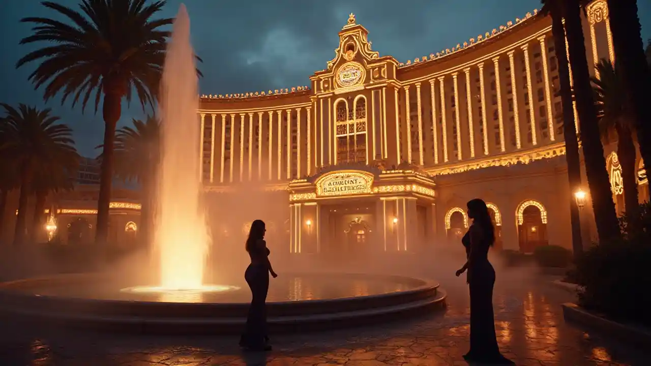 Casino ya kichawi inayoonekana kutoka kwenye ukungu mzito, dhahabu na nyeusi, super maridadi, taa za neon, wanawake wazuri na chemchemi ya kasino mbele ya jengo