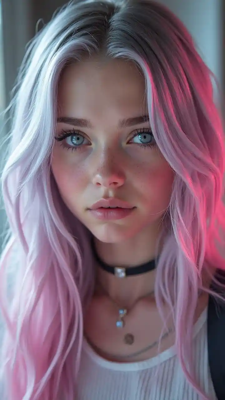 ZoeKijana wa kichawi msichana na nywele ndefu fedha kung'aa metali katika nyekundu, fedha macho mazuri, nyuso nzuri teen, girl, grunge, waasi vifaa