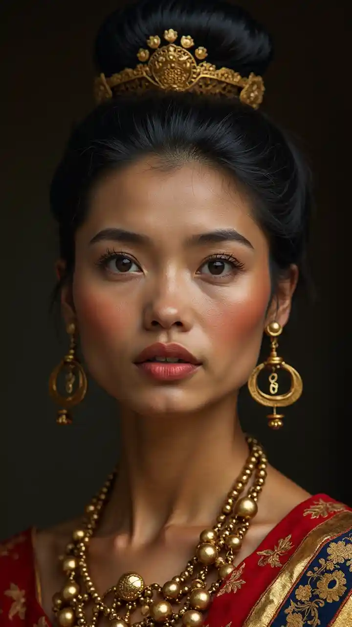 Tribhuwana Wijayatunggadewi, malkia kutoka Majapahit, ana kivuli cha neema ya kifalme na ubunifu. Sura yake inaonyesha uzuri wa Kijava, na macho yake makubwa yanayoonyesha hekima na uwezo wa kukabiliana na hali. Uso wake una pua maridadi inayoonyesha kwamba ni mtu wa hali ya juu, na midomo yake ina umbo la kupendeza lakini lenye nguvu.