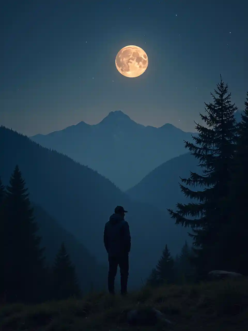 mtu juu katikati ya mlima msitu, usiku, miezi mitano