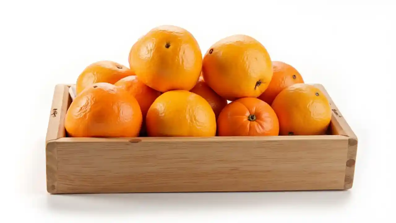 Mandarin katika sanduku la mbao kutengwa juu ya background uwazi au nyeupe