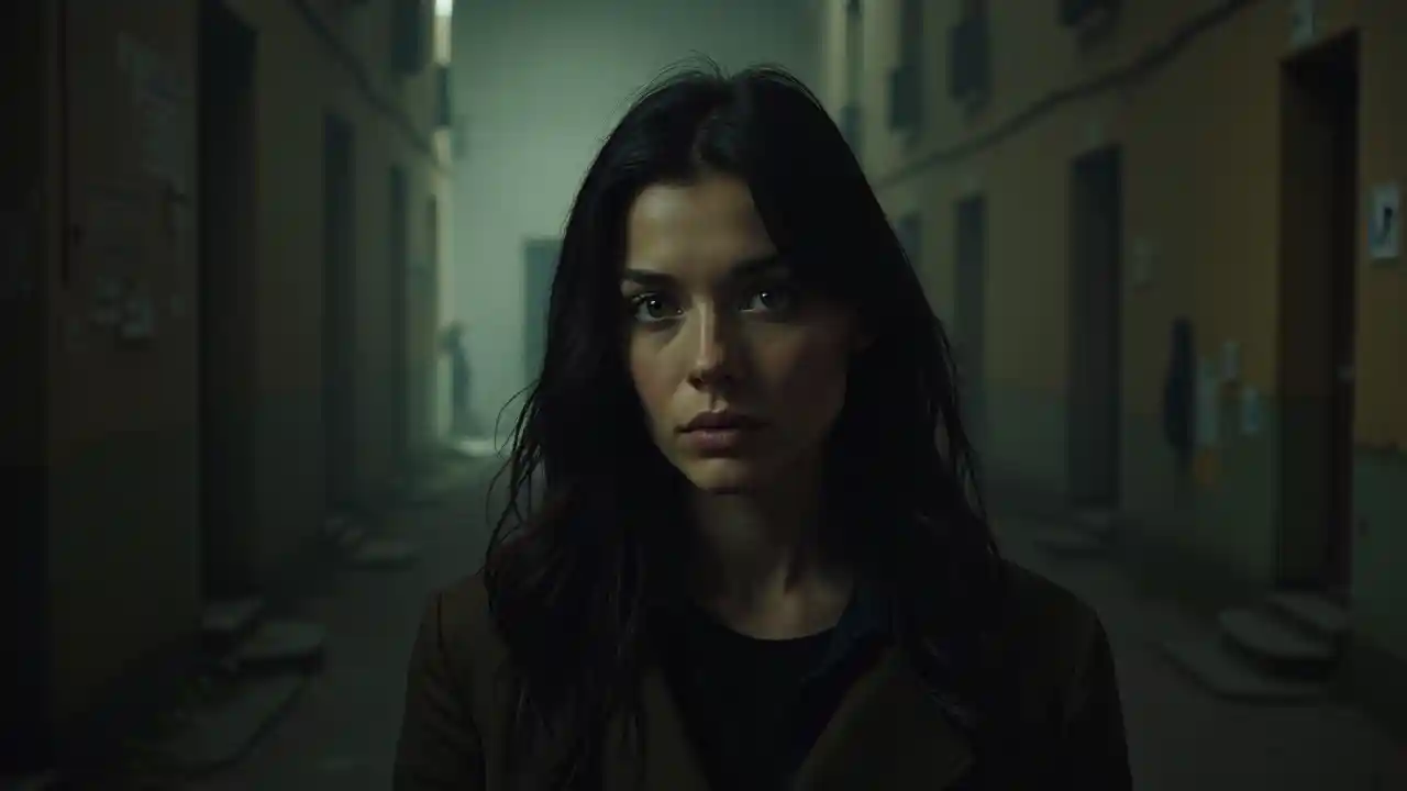 picha ndefu ya Marilyn vos savant, anga la ajabu, rangi zisizo na sauti, nyuso zenye rangi tofauti, nywele ndefu za giza, amevaa koti