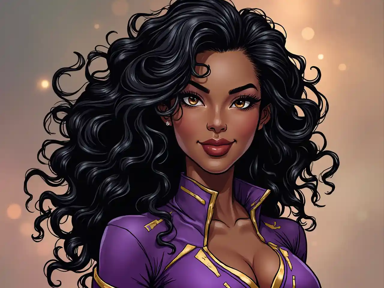 ZoeMwanamke mweusi mwenye nywele ndefu zenye mikunjo katika suti ya zambarau na ya dhahabu, mtindo wa vichekesho vya Marvel