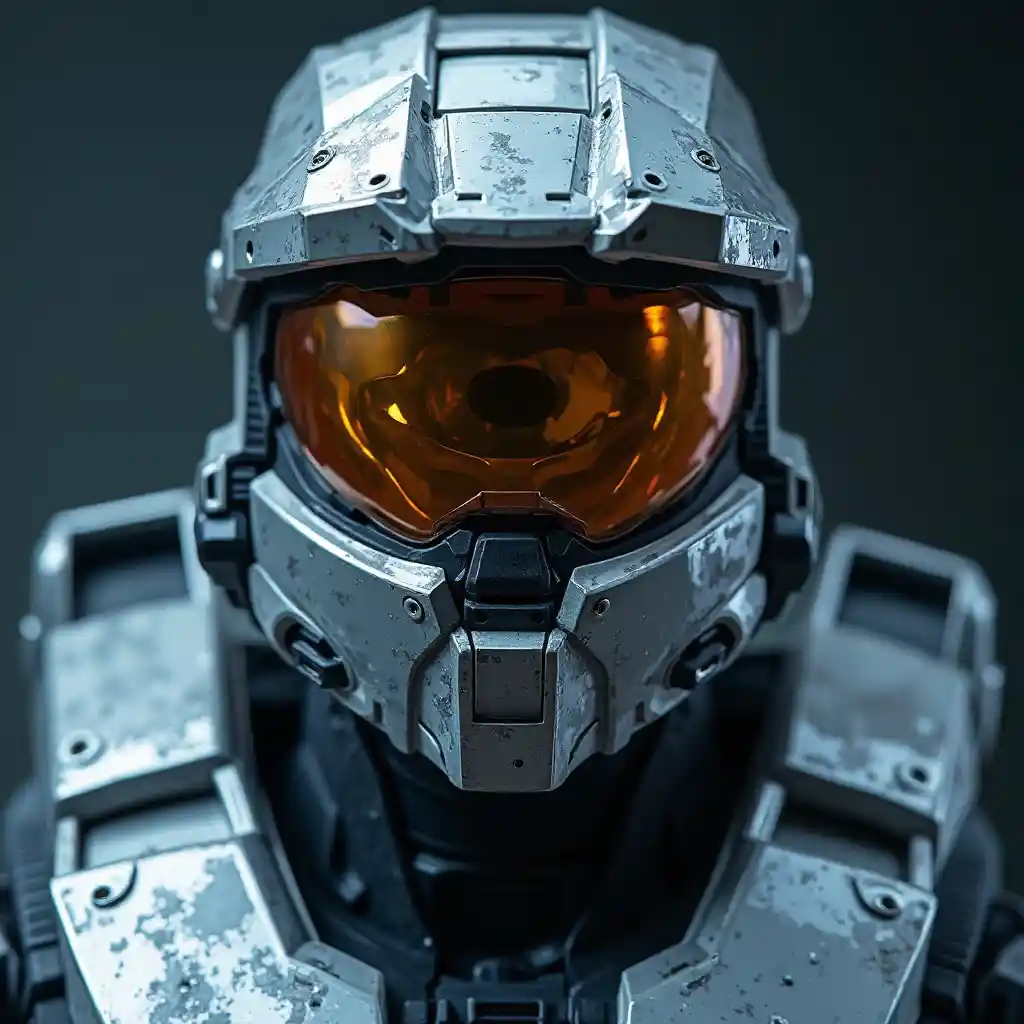 super kweli mtaalamu picha ya karibu sana ya kina ya kisasa ya baadaye tabia, mkuu kutoka Halo mchezo wa video, plastiki fedha glossy nyenzo na texture mpira, picha ya karibu