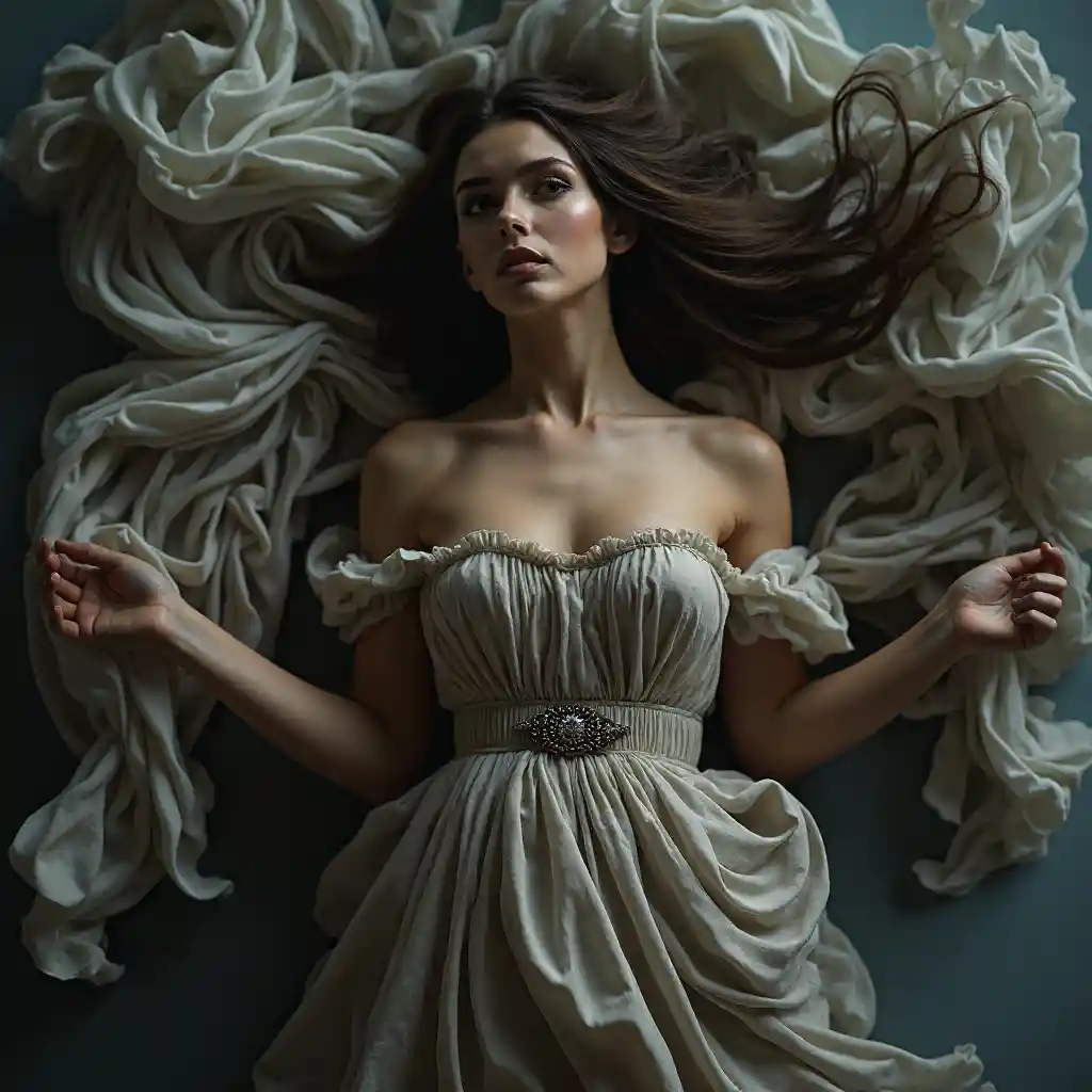 Masterpiece, mavazi, ubora wa juu, sanaa muse, kuzungukwa na kitambaa swirling, (kitambaa kina: 1.2), (kutana kitambaa: 1.2), picha na Peter Lindbergh na Dave lachapelle, karibu, Sony A9 II, f2.0, iso 100, muundo wa nguvu, usemi wa utu, nishati ya awali, uzuri wa msingi, azimio la juu, uhd, hdr, fashion photoshoot, Lao, iris flare