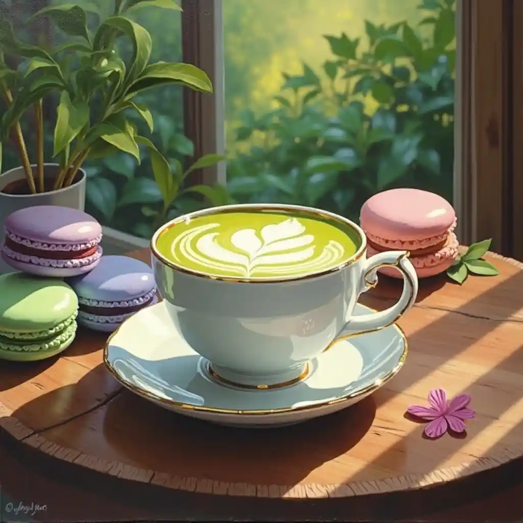 Mchoro mzuri wa mafuta unaoonyesha chai ya matcha iliyo na rangi ya rangi ya rangi ya bluu iliyo kwenye kikombe cha kauri, na rangi ya kijani-kibichi iliyo na rangi ya bluu inayozunguka kwa upole juu ya povu. Lacté hiyo iko kwenye meza ya mbao, na imezungukwa na macaroni yenye rangi mbalimbali, rangi zake za manjano, laventeri, na rangi ya waridi-rosa, ambazo huangaza chini ya jua lenye joto linalopita kupitia dirisha lililo karibu. Mazingira ni mepesi, na kuna kijani kibichi nje, na hivyo kuashiria mazingira ya kafeteria. Vivuli vyenye upole huangaza mandhari, na hivyo kuongeza rangi ya macaroni na rangi ya latte. Hali ya hewa ni yenye kufurahisha na yenye kuvutia, ikifanya mtu ahisi ametu.