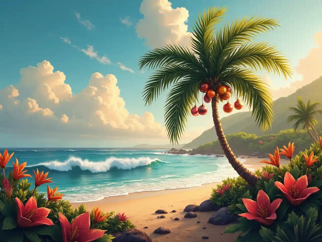 Mtende mfupi wenye mipira ya Krismasi na taa juu yake katika kisiwa cha Maui na mchanga wa dhahabu na mawimbi ya juu na maua ya kitropiki yenye rangi nyingi