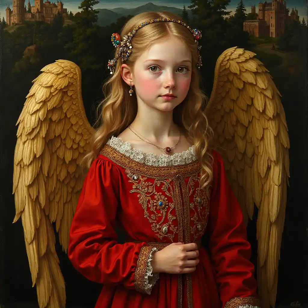 Msichana mchanga mwenye mabawa ya dhahabu katika mavazi ya rangi ya rangi ya rangi ya rangi ya rangi ya dhahabu, vilemba, laini ya bei ghali, na nywele za rangi ya bluu, vito vya karne ya 15 kwenye nywele zake, nyuma ya miti na majumba, mtindo wa Lucas Cranach, mtindo wa medieval