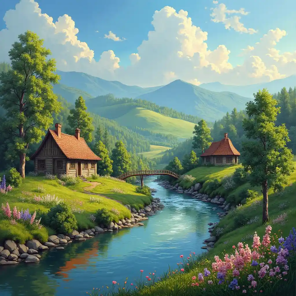 (Picha za kale za kihistoria za Urusi za mandhari), rangi za kiangazi zenye kupendeza, vilima vyenye kijani kibichi, maua ya porini yanayopambazuka, mto wenye utulivu unaong'aa chini ya jua, nyumba za mbao zenye kupendeza zilizo katikati ya miti, njia ndogo za kuvuka mto, (vipande vya rangi ya kijani) vinaonyesha uzuri wa kijijini, mawingu ya anga katika anga ya bluu, mtindo wa uchoraji, (mfano wa kina), mazingira yenye kung'aa na yenye kuvutia, huchochea upendezi wa asili, sanaa huchochea upendezi wa asili na kutafari kwa amani.