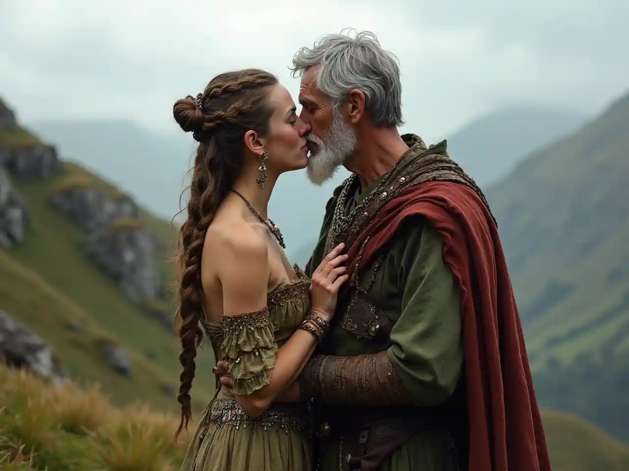 Picha ya urefu kamili ya mwanamke wa miaka 30 wa Ufalme wa Powys katika Wales ya kati mwaka 1050AD akibusu mzee kwenye mlima ambao unaongezeka nyuma yao. Ana nywele kufanywa katika mtindo wa Welsh wa kale. Anavaa mavazi ya Kiingereza ya enzi ya kati. Anavaa uso wa Welsh wa enzi za kati na mapambo ya mwili..