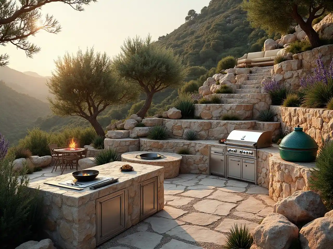 A breathtaking Mediterranean terraced garden built into a sun-kissed hillside, designed with ancient stone retaining walls, curved stairs, and layered levels rich with aromatic plants. The centerpiece is a luxurious outdoor kitchen with a built-in stainless steel BBQ grill, a green ceramic kamado cooker, a sleek stone sink, and undercounter storage, all set in a hand-laid rustic stone island. Above the kitchen area, a circular fire pit with a glowing flame is embedded in a cozy lounge framed by a semicircular stone wall. Around it, built-in stone seating with thick beige cushions invites gathering at sunset. Olive trees cast gentle shadows across the natural terrain, surrounded by rosemary, lavender, agaves, ornamental grasses, and scattered boulders. Golden hour lighting illuminates the scene with warm ambient tones, casting cinematic shadows and sun flares. The ground is uneven and organic, covered in gravel and dry soil. The atmosphere is serene, romantic, and inspiring — a perfect harmony between structure and nature. The composition should highlight elevation, organic flow, and the contrast between raw stone, soft textures, and green life. Photorealistic detail, ultra-sharp, 8K render quality, soft depth of field, warm color grading. A dream garden for modern natural living.