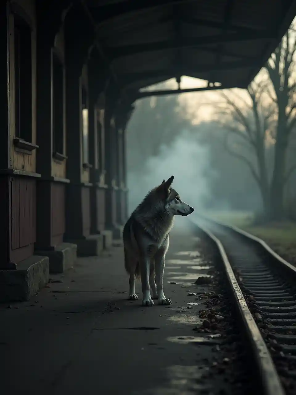 Jioni ya Kutafakari Kwenye Kituo cha Reli cha Zamani Nikiwa na Mbwa-Mwitu