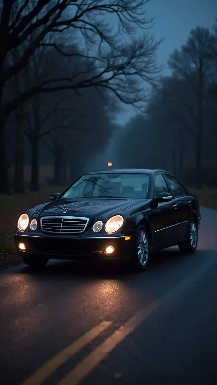 Mercedes w211 2004 mfano katika usiku juu ya barabara na D4AF37 rangi