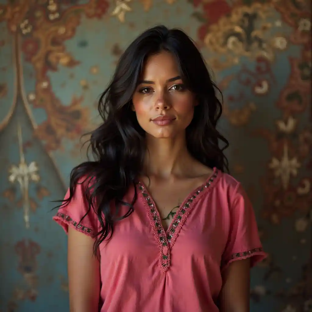 AdelineLinda garota negra amevaa shati la waridi, nywele nyepesi, ndefu na nzuri picha hyper realista katika mazingira ya Mexico
