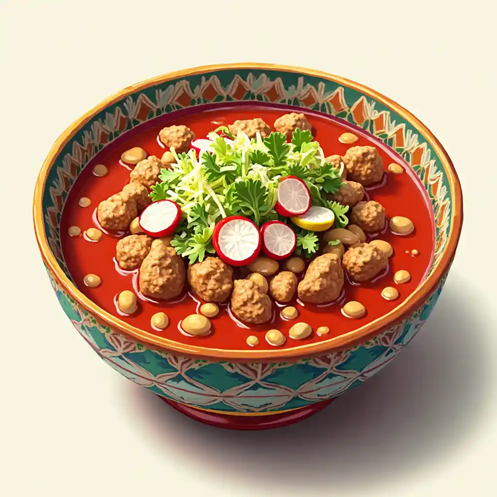 Maelezo ya kina ya mtindo wa 3D wa pozole ya jadi ya Mexico inayotumiwa katika bakuli la sherehe. Pozole inapaswa kutia ndani mchuzi mwekundu, homini, vipande vya nyama, na mapambo kama vile saladi, miberoshi, vipande vya lima, na kipande cha oregano. Chakula hicho kinapaswa kuonekana kuwa chenye kupendeza na cha kweli, kikiwekwa kwenye uso safi, na kupambwa kwa njia ya sherehe.